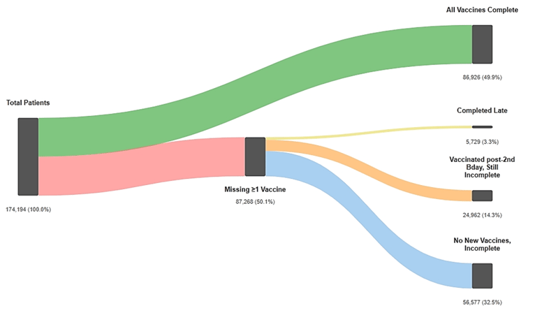 The above chart breaks down the patients who missed the measure into a few relevant subcategories. The first subcategory (in yellow) is patients who weren’t fully vaccinated by their second birthday, but ultimately completed the full course of vaccines. The second category (in orange) represents patients who received some additional vaccines after turning 2 but are still missing others. The remaining patients (in blue) missed the measure and haven’t gotten any vaccines after 2.