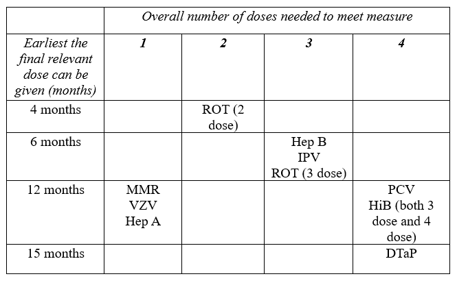 Looking at the recommended dosage schedule helps make the pattern clearer. Table 1 (below) shows the earliest age (in months) when the final dose of each vaccine can be given. The table is based on the recommended Child and Adolescent Immunization Schedule from the CDC.