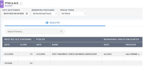 In addition to alerts, users can create a custom registry using data elements of ACE screening, PTSD screening, PTSD diagnosis, and behavioral health encounter. You can add other data elements like chronic disease diagnoses, most recent vital signs, and social determinants of health to gain a deeper understanding of challenges the patient might be facing.